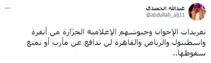 وشدد في تغريدة على حسابه بموقع التدوين المصغر تويتر، اليوم على أن: "تغريدات الإخوان وجيوشهم الإعلامية الجرّارة من أنقرة واسطنبول والرياض والقاهرة لن تدافع عن مأرب أو تمنع سقوطها".