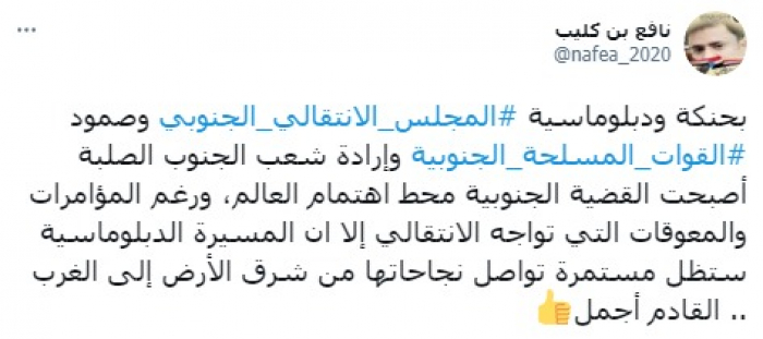 أكد الناشط السياسي نافع بن كليب، أن المسيرة الدبلوماسية للمجلس الانتقالي الجنوبي لطرح القضية الجنوبية على المجتمع الدولي تواصل نجاحها رغم المؤامرات.