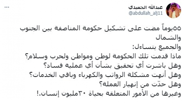 وقال في تغريدة على حسابه بموقع التدوين المصغر تويتر، اليوم إن: "55 يوما مضت على تشكيل حكومة المناصفة بين الجنوب والشمال".