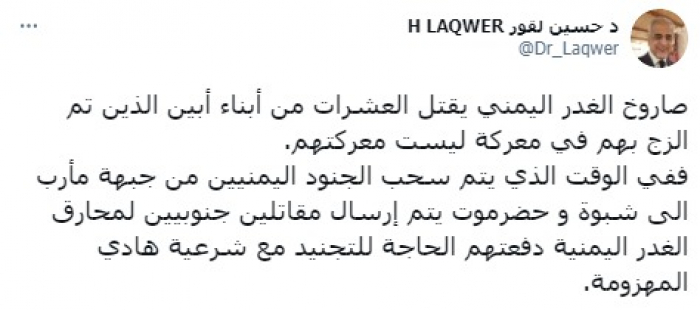 وأشار في تغريدة على حسابه بموقع التدوين المصغر تويتر، اليوم إلى أن: "صاروخ الغدر اليمني يقتل العشرات من أبناء أبين الذين تم الزج بهم في معركة ليست معركتهم".