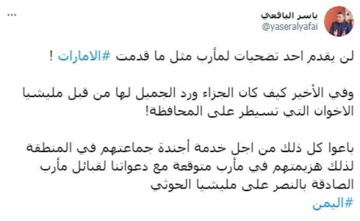 ولفت في تغريدة على حسابه بموقع التدوين المصغر تويتر، اليوم إلى أنه: "لن يقدم أحد تضحيات لمأرب مثل ما قدمت الإمارات".