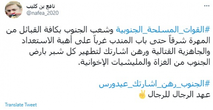 وكتب في تغريدة عبر "تويتر" رصدها "المشهد العربي": "القوات المسلحة الجنوبية وشعب الجنوب بكافة القبائل من المهرة شرقًا حتى باب المندب غربًا على أهبة الاستعداد والجاهزية القتالية ورهن إشارتك لتطهير كل شبر بارض الجنوب من الغزاة والمليشيات الإخوانية".