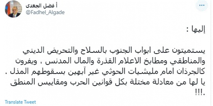وقال في تغريدة عبر "تويتر" رصدها "المشهد العربي": "يستميتون على أبواب الجنوب بالسلاح والتحريض الديني والمناطقي ومطابخ الإعلام القذرة والمال المدنس، ويفرون كالجرذان أمام مليشيات الحوثي غير آبهين بسقوطهم المذل".