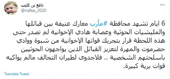 وقال في تغريدة عبر "تويتر" رصدها "المشهد العربي": "6 أيام تشهد محافظة مأرب معارك عنيفة بين قبائلها والمليشيات الحوثية وعصابة هادي الإخوانية لم تصدر حتى هذه اللحظة قرار بتحريك قواتها الإخوانية من شبوة ووادي حضرموت والمهرة لتعزيز القبائل الذين يواجهون الحوثيين باسلحتهم الشخصية".