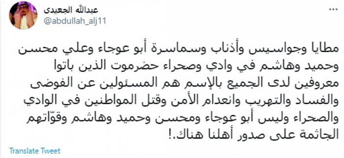 وكتب في تغريدة عبر "تويتر" رصدها "المشهد العربي": "مطايا وجواسيس وأذناب وسماسرة أبو عوجاء وعلي محسن وحميد وهاشم في وادي وصحراء حضرموت الذين باتوا معروفين لدى الجميع بالاسم هم المسئولين عن الفوضى والفساد والتهريب وانعدام الأمن وقتل المواطنين في الوادي والصحراء وليس أبو عوجاء ومحسن وحميد وهاشم وقوّاتهم الجاثمة على صدور أهلنا هناك".