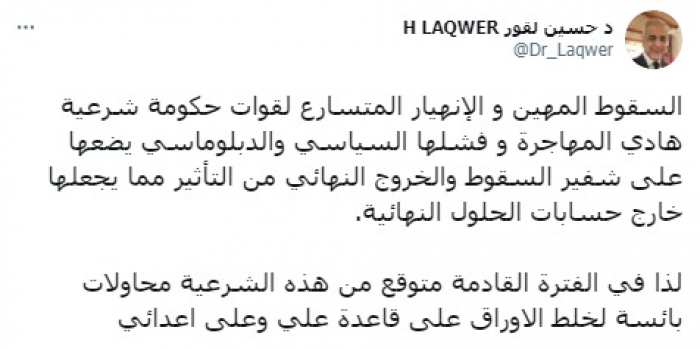 وأشار في تغريدة على حسابه بموقع التدوين المصغر تويتر، اليوم إلى أن: "السقوط المهين والانهيار المتسارع لقوات حكومة شرعية هادي المهاجرة وفشلها السياسي والدبلوماسي يضعها على شفير السقوط والخروج النهائي من التأثير مما يجعلها خارج حسابات الحلول النهائية".