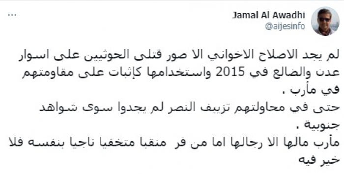 وأكد في تغريدة على حسابه بموقع التدوين المصغر تويتر، اليوم أنه: "لم يجد الإصلاح الاخواني إلا صور قتلى الحوثيين على أسوار عدن والضالع في 2015 واستخدامها كإثبات على مقاومتهم في مأرب".