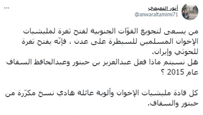 ونبه في تغريدة على حسابه بموقع التدوين المصغر تويتر، اليوم على أن: "من يسعى لتجويع القوّات الجنوبية لفتح ثغرة لمليشيات الإخوان المسلمين للسيطرة على عدن، فإنّه يفتح ثغرة للحوثي وإيران".