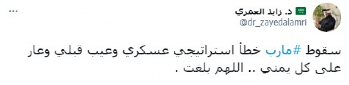 وقال في تغريدة على حسابه بموقع التدوين المصغر تويتر، اليوم إن: "سقوط مارب خطأ استراتيجي عسكري وعيب قبلي وعار على كل يمني .. اللهم بلغت".
