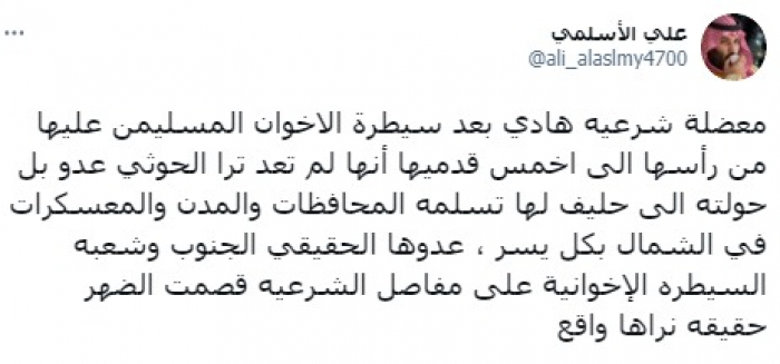 ولفت في تغريدة على حسابه بموقع التدوين المصغر تويتر، اليوم إلى أن: "معضلة شرعية هادي بعد سيطرة الإخوان المسلمين عليها من رأسها الى أخمس قدميها أنها لم تعد ترى الحوثي عدوا".