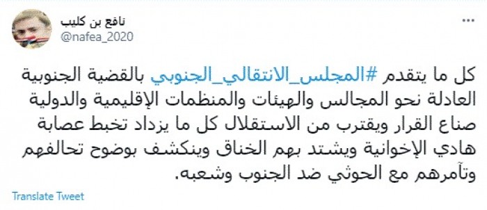 وكتب في تغريدة عبر "تويتر" رصدها "المشهد العربي": "كل ما يتقدم المجلس الانتقالي الجنوبي بالقضية الجنوبية العادلة نحو المجالس والهيئات والمنظمات الإقليمية والدولية صناع القرار ويقترب من الاستقلال كل ما يزداد تخبط عصابة هادي الإخوانية ويشتد بهم الخناق وينكشف بوضوح تحالفهم وتآمرهم مع الحوثي ضد الجنوب وشعبه".