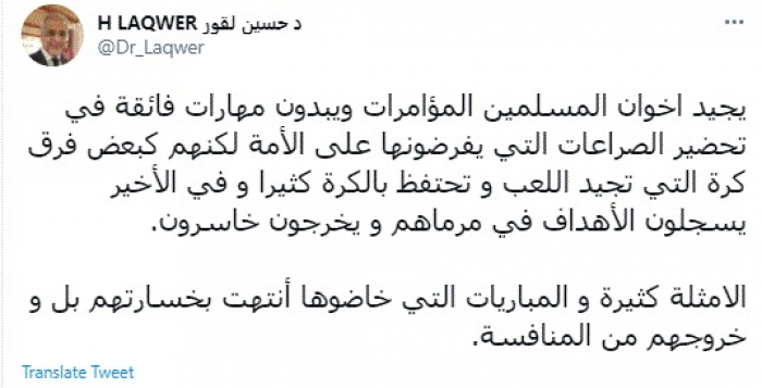 وكتب في تغريدة عبر "تويتر" رصدها "المشهد العربي": "يجيد إخوان المسلمين المؤامرات ويبدون مهارات فائقة في تحضير الصراعات التي يفرضونها على الأمة لكنهم كبعض فرق كرة التي تجيد اللعب وتحتفظ بالكرة كثيرًا وفي الأخير يسجلون الأهداف في مرماهم ويخرجون خاسرون".