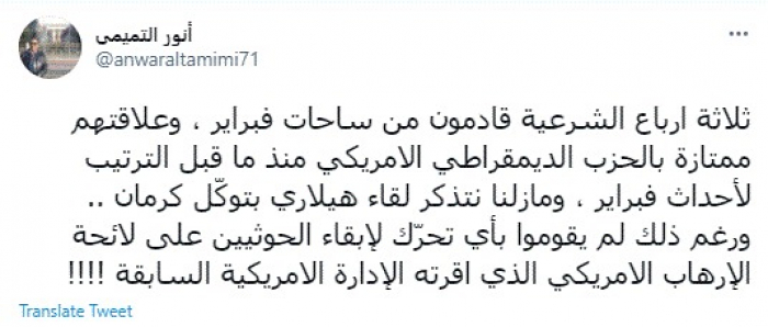 وقال في تغريدة عبر "تويتر" رصدها "المشهد العربي": "ثلاثة أرباع الشرعية قادمون من ساحات فبراير، وعلاقتهم ممتازة بالحزب الديمقراطي الأمريكي منذ ما قبل الترتيب لأحداث فبراير، ومازلنا نتذكر لقاء هيلاري بتوكّل كرمان".
