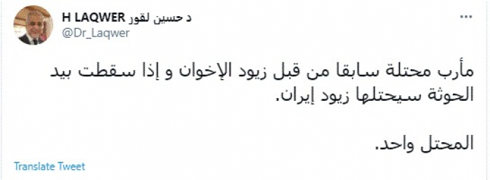 وقال في تغريدة عبر "تويتر" رصدها "المشهد العربي": "مأرب محتلة سابقًا من قبل زيود الإخوان و إذا سقطت بيد الحوثة سيحتلها زيود إيران".