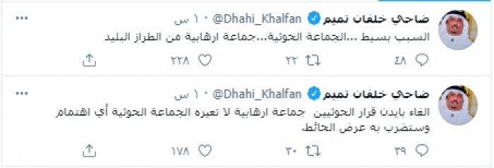 وكتب "خلفان" عبر تغريدة رصدها "المشهد العربي": "إلغاء بايدن قرار الحوثيين جماعة إرهابية لا تعيره الجماعة الحوثية أي اهتمام وستضرب به عرض الحائط".