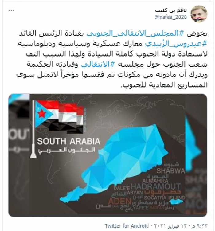 وكتب "بن كليب" تغريدة عبر حسابه بتويتر، رصدها "المشهد العربي": "يخوض المجلس الانتقالي الجنوبي بقيادة الرئيس القائد عيدروس الزُبيدي، معارك عسكرية وسياسية ودبلوماسية لاستعادة دولة الجنوب كاملة السيادة، ولهذا السبب التف شعب الجنوب حول مجلسه الانتقالي وقيادته الحكيمة ويدرك أن ما دونه من مكونات تم فقسها مؤخرا لا تمثل سوى المشاريع المعادية للجنوب".