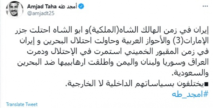 وقال في تغريدة عبر "تويتر" رصدها "المشهد العربي": "إيران في زمن الهالك الشاه (الملكية) وأبو الشاه احتلت جزر الإمارات(3) والأحواز العربية وحاولت احتلال البحرين وإيران في زمن المقبور الخميني استمرت في الاحتلال ودمرت العراق وسوريا ولبنان واليمن وأطلقت إرهابييها ضد البحرين والسعودية".