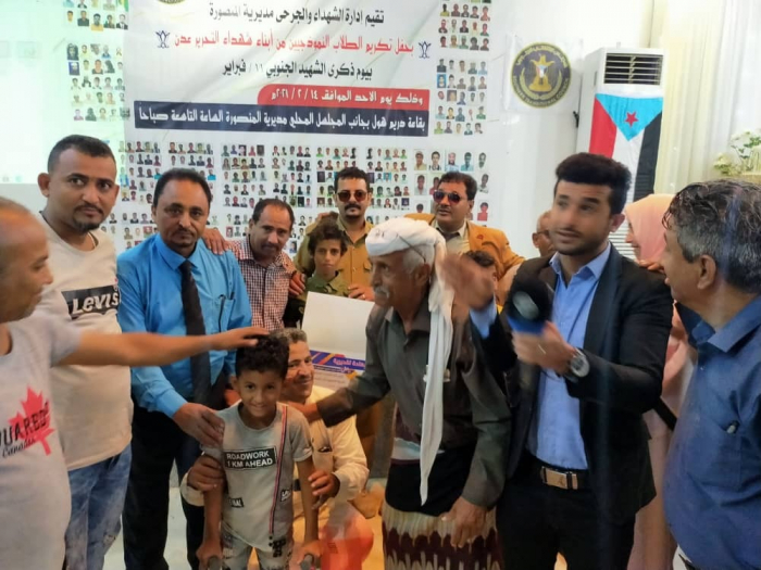 في لمسة وفاء، كرمت إدارة الشهداء والجرحى بالقيادة المحلية للمجلس الانتقالي الجنوبي في مديرية المنصورة بالعاصمة عدن، اليوم الأحد، الطلاب النموذجيين من أبناء شهداء الجنوب إبان تحرير العاصمة عدن في العام 2015.