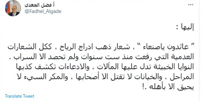 قال عضو هيئة رئاسة المجلس الانتقالي الجنوبي فضل الجعدي، اليوم، إن شعار "عائدون يا صنعاء" ذهب أدراج الرياح مثل الشعارات العدمية التي رفعت منذ ست سنوات ولم تحصد إلا السراب.