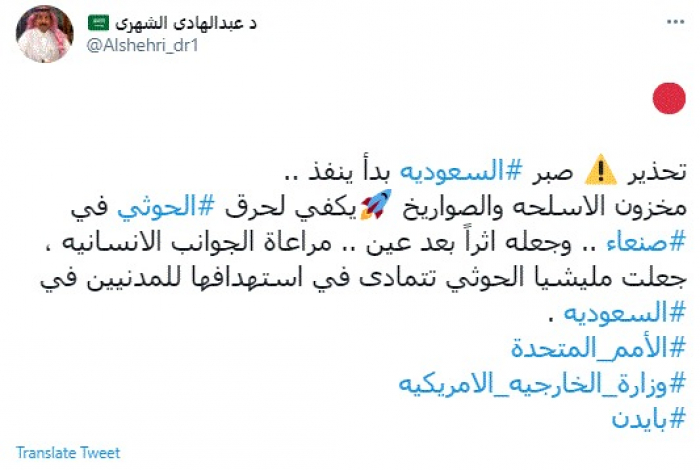 وقال في تغريدة عبر "تويتر" رصدها "المشهد العربي": "تحذير.. صبر السعودية بدأ ينفذ.. مخزون الأسلحة والصواريخ يكفي لحرق الحوثي في صنعاء .. وجعله أثراً بعد عين .. مراعاة الجوانب الإنسانية، جعلت مليشيا الحوثي تتمادى في استهدافها للمدنيين في السعودية".