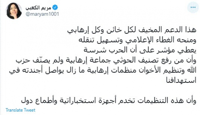 وكتبت في تغريدة عبر "تويتر" رصدها "المشهد العربي": " هذا الدعم المخيف لكل خائن وكل إرهابي ومنحه الغطاء الإعلامي وتسهيل تنقله يعطي مؤشر على أن الحرب شرسة وأن من رفع تصنيف الحوثي جماعة إرهابية ولم يصنّف حزب الله وتنظيم الإخوان منظمات إرهابية ما زال يواصل أجندته في استهدافنا وأن هذه التنظيمات تخدم أجهزة استخباراتية وأطماع دول".