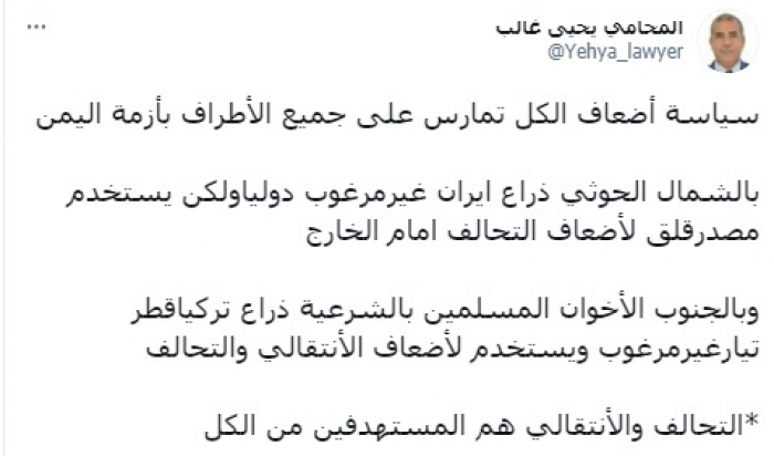 رأى الناشط السياسي يحيى غالب أن هناك أطرافا تتعمد إنهاك التحالف والجنوب بالحفاظ على وجود تنظيم الإخوان الإرهابي ومليشيا الحوثي الإرهابية المدعومة من إيران.