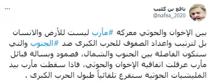 وشدد في تغريدة على حسابه بموقع التدوين المصغر، تويتر، اليوم على أنه: "بين الإخوان والحوثي معركة مأرب ليست للأرض والإنسان، بل لترتيب وإعداد الصفوف للحرب الكبرى ضد الجنوب".