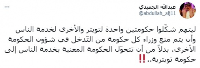 وقال في تغريدة على حسابه بموقع التدوين المصغر تويتر، اليوم: "ليتهم شكّلوا حكومتين واحدة لتويتر والأخرى لخدمة الناس، وأن يتم منع وزراء كل حكومة من التّدخل في شؤون الحكومة الأخرى".
