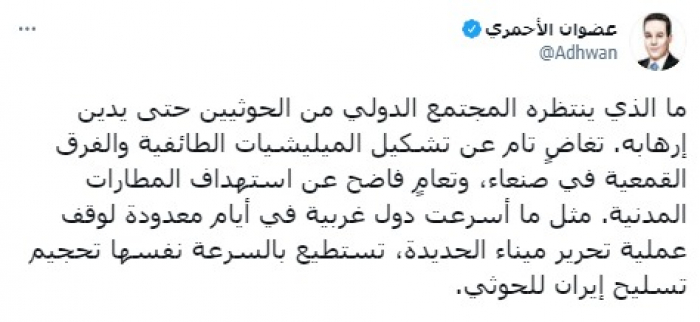 وتساءل في تغريدة على حسابه بموقع التدوين المصغر تويتر، اليوم قائلا: "ما الذي ينتظره المجتمع الدولي من الحوثيين حتى يدين إرهابه؟".