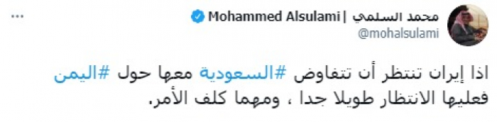 السلمي: انتظار إيران للتفاوض مع السعودية على اليمن سيطول