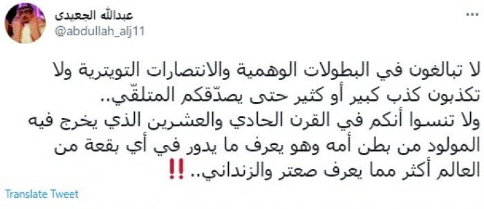 وقال في تغريدة عبر "تويتر" رصدها "المشهد العربي": "لا تبالغون في البطولات الوهمية والانتصارات التويترية ولا تكذبون كذب كبير أو كثير حتى يصدّقكم المتلقّي".