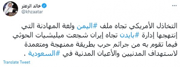 وكتب في تغريدة عبر "تويتر" رصدها "المشهد العربي": "التخاذل الأمريكي تجاه ملف اليمن ولغة المهادنة التي انتهجتها إدارة بايدن تجاه إيران شجعت مليشيات الحوثي فيما تقوم به من جرائم حرب بطريقة ممنهجة ومتعمدة لاستهداف المدنيين والأعيان المدنية في السعودية".