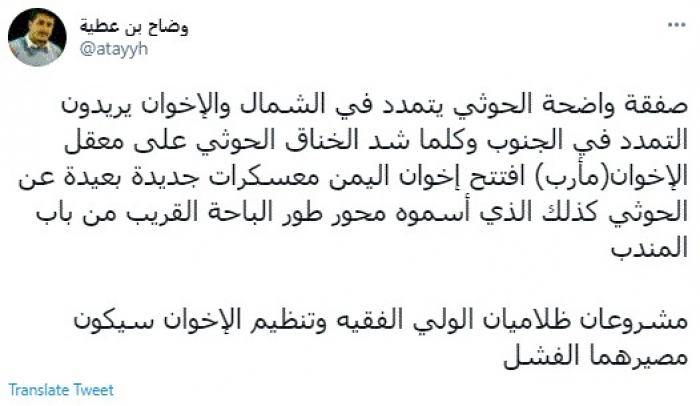 وقال في تغريدة عبر "تويتر" رصدها "المشهد العربي": "صفقة واضحة الحوثي يتمدد في الشمال والإخوان يريدون التمدد في الجنوب وكلما شد الخناق الحوثي على معقل الإخوان (مأرب) افتتح إخوان اليمن معسكرات جديدة بعيدة عن الحوثي كذلك الذي أسموه محور طور الباحة القريب من باب المندب".