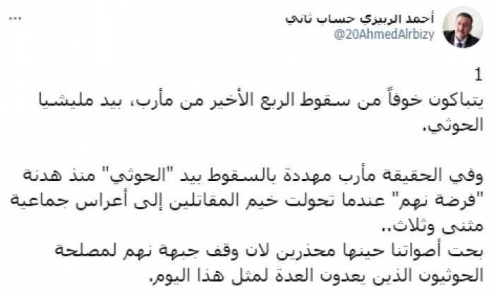ونبه في تغريدة على حسابه بموقع التدوين المصغر تويتر، اليوم إلى أنهم: "يتباكون خوفا من سقوط الربع الأخير من مأرب، بيد مليشيا الحوثي".