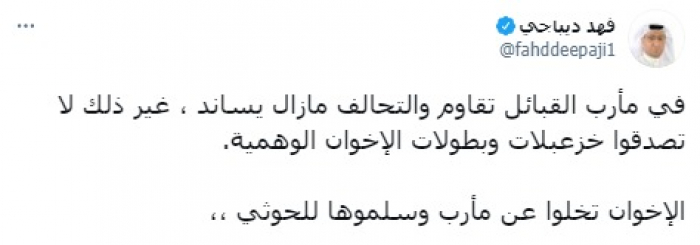 وأضاف: "غير ذلك لا تصدقوا خزعبلات وبطولات الإخوان الوهمية"، مشددا على أن: "الإخوان تخلوا عن مأرب وسلموها للحوثي".