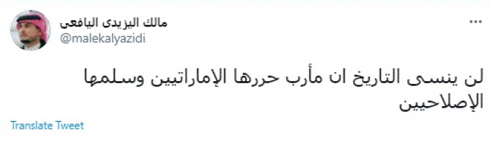 وكتب في تغريدة عبر "تويتر" رصدها "المشهد العربي": "لن ينسى التاريخ أن مأرب حررها الإماراتيون وسلمها الإصلاحيون".