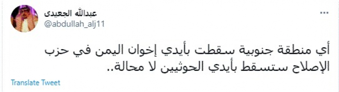 وكتب في تغريدة عبر "تويتر" رصدها "المشهد العربي": "أي منطقة جنوبية سقطت بأيدي إخوان اليمن في حزب الإصلاح ستسقط بأيدي الحوثيين لا محالة".