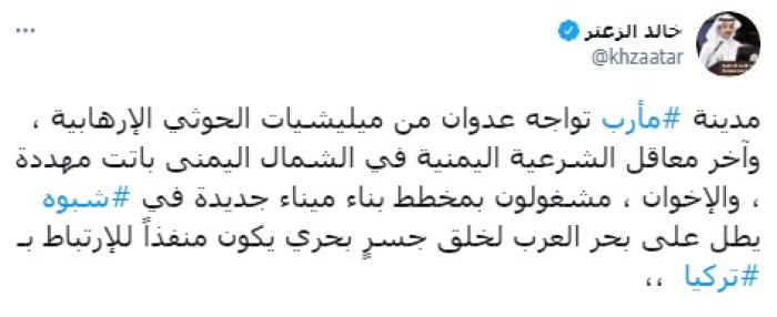 ونبه في تغريدة على حسابه بموقع التدوين المصغر تويتر، اليوم إلى أن: "مدينة مأرب تواجه عدوانا من مليشيات الحوثي الإرهابية، وآخر معاقل الشرعية اليمنية في الشمال اليمنى باتت مهددة".