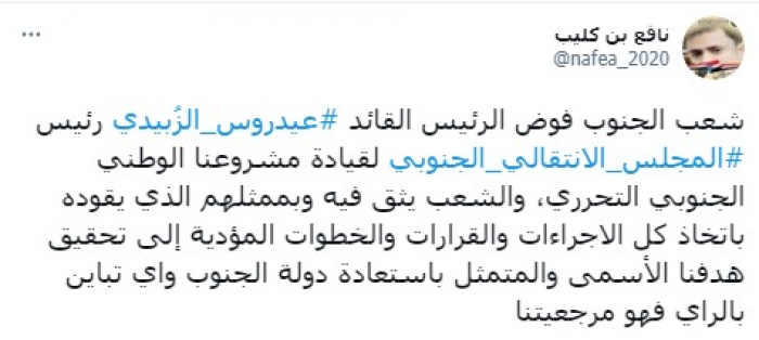وشدد في تغريدة على حسابه بموقع التدوين المصغر تويتر، اليوم على أن: "شعب الجنوب فوض الرئيس القائد عيدروس الزُبيدي رئيس المجلس الانتقالي الجنوبي لقيادة مشروعنا الوطني الجنوبي التحرري".