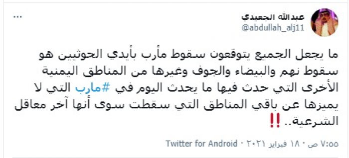 وكتب "الجعيدي" تغريدة عبر حسابه بتويتر، رصدها "المشهد العربي": " ما يجعل الجميع يتوقعون سقوط مأرب بأيدي الحوثيين هو سقوط نهم والبيضاء والجوف وغيرها من المناطق اليمنية الأخرى التي حدث فيها ما يحدث اليوم في مأرب التي لا يميزها عن باقي المناطق التي سقطت سوى أنها آخر معاقل الشرعية".