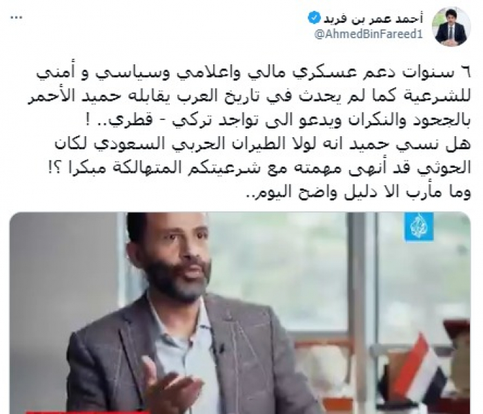 وكتب "بن فريد" تغريدة عبر حسابه بتويتر، رصدها "المشهد العربي": " 6 سنوات دعم عسكري مالي وإعلامي وسياسي و أمني للشرعية كما لم يحدث في تاريخ العرب، يقابله حميد الأحمر، بالجحود والنكران ويدعو إلى تواجد تركي – قطري".
