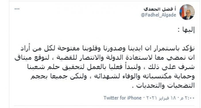 وكتب "الجعدي" تغريدة عبر حسابه بتويتر، رصدها "المشهد العربي":"نؤكد باستمرار أن أيدينا وصدورنا وقلوبنا مفتوحة لكل من أراد أن نمضي معًا لاستعادة الدولة والانتصار للقضية".