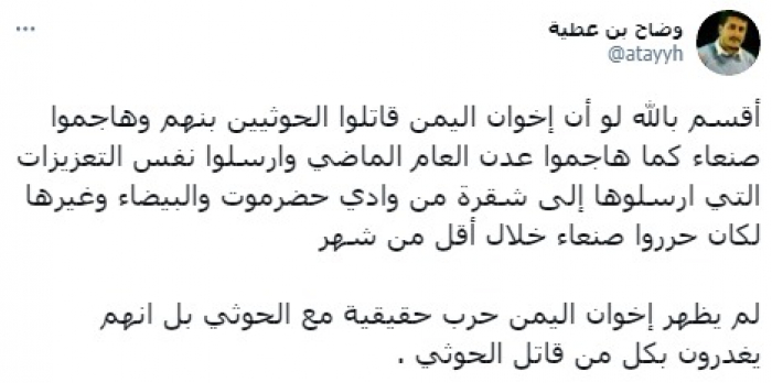 وقال في تغريدة على حسابه بموقع التدوين المصغر تويتر، اليوم: "أقسم بالله لو أن إخوان اليمن قاتلوا الحوثيين بنهم وهاجموا صنعاء كما هاجموا عدن العام الماضي وأرسلوا نفس التعزيزات التي أرسلوها إلى شقرة من وادي حضرموت والبيضاء وغيرها لكانوا حرروا صنعاء خلال أقل من شهر".