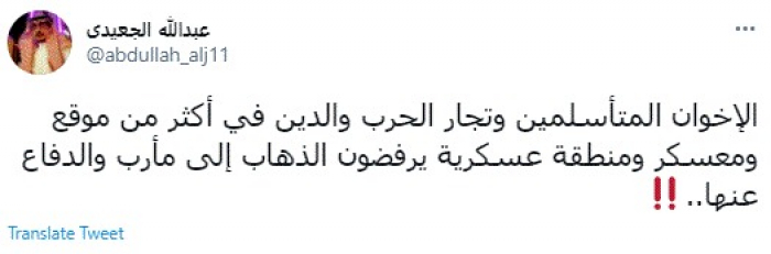 وقال في تغريدة عبر "تويتر" رصدها "المشهد العربي": "الإخوان المتأسلمين وتجار الحرب والدين في أكثر من موقع ومعسكر ومنطقة عسكرية يرفضون الذهاب إلى مأرب والدفاع عنها".