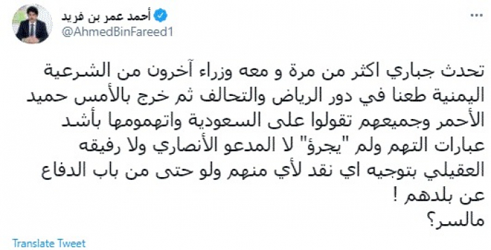وقال في تغريدة عبر "تويتر" رصدها "المشهد العربي": "تحدث جباري أكثر من مرة و معه وزراء آخرون من الشرعية اليمنية طعنًا في دور الرياض والتحالف ثم خرج بالأمس حميد الأحمر وجميعهم يقولوا على السعودية واتهمومها بأشد عبارات التهم".