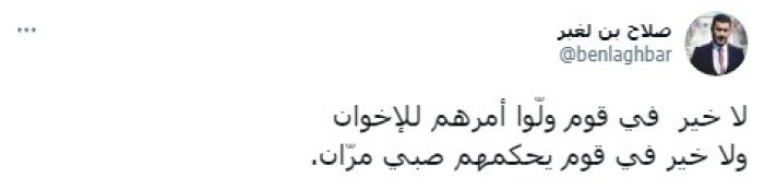 وأوضح في تغريدة على حسابه بموقع التدوين المصغر تويتر، اليوم أنه: "لا خير في قوم ولّوا أمرهم للإخوان ولا خير في قوم يحكمهم صبي مرّان".