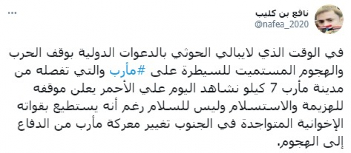 وأشار في تغريدة على حسابه بموقع التدوين المصغر تويتر، اليوم إلى أنه: "في الوقت الذي لا يبالي الحوثي بالدعوات الدولية بوقف الحرب والهجوم المستميت للسيطرة على مأرب والذي تفصله من مدينة مأرب 7 كيلو، نشاهد اليوم علي الأحمر يعلن موقفه للهزيمة والاستسلام وليس للسلام".