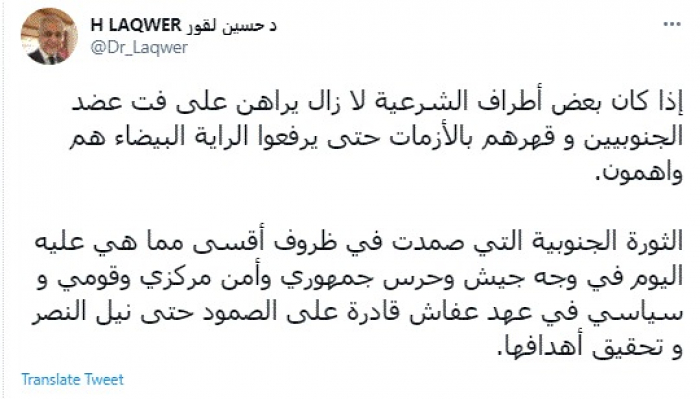 رد المحلل السياسي الدكتور حسين لقور، اليوم، على محاولات بعض أطراف الشرعية بالرهان على قهر الجنوبيين بالأزمات، مؤكدًا أن تلك المساعي ستفشل.