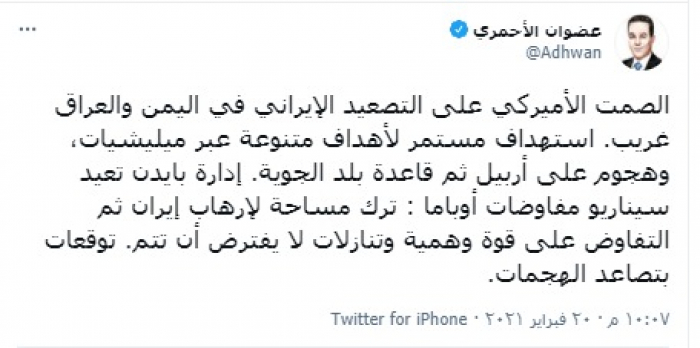وكتب "الأحمري" تغريدة عبر تويتر، رصدها "المشهد العربي": قال فيها: "الصمت الأميركي على التصعيد الإيراني في اليمن والعراق غريب، استهداف مستمر لأهداف متنوعة عبر ميليشيات، وهجوم على أربيل ثم قاعدة بلد الجوية".