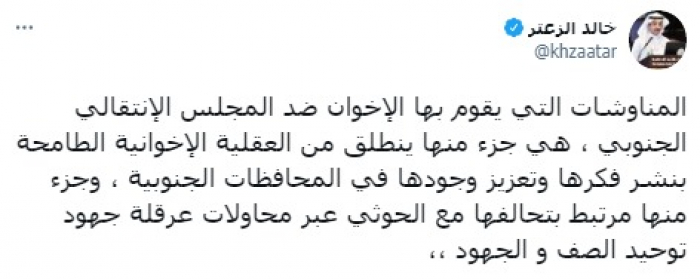 الزعتر: الإخوان متحالفون مع الحوثيين ويعادون الانتقالي